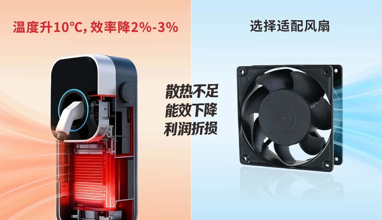 实测数据显示,风扇功耗仅占整桩总损耗的5%-8%,却能直接决定能效最终表现。充电桩核心器件对温度极度敏感:温度每升高10℃,效率就会下滑2%-3%,若散热不足,使用寿命甚至可能折损过半。能效波动直接影响产品市场竞争力与长期运营收益。