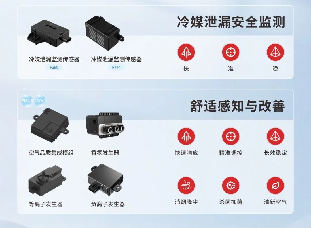 随着智能汽车普及,汽车空调逐渐升级为保障驾乘舒适与安全的核心单元。四方光电提供完善的空调舒适及安全解决方案:PM2.5传感器、CO₂传感器、AQS空气质量传感器实时监测座舱空气品质,联动空调或新风系统,守护健康呼吸环境;香氛发生器、负离子/等离子发生器等装置,有效提升座舱舒适性;R290/R744冷媒传感器实时监测冷媒泄漏,多方位护航汽车安全。